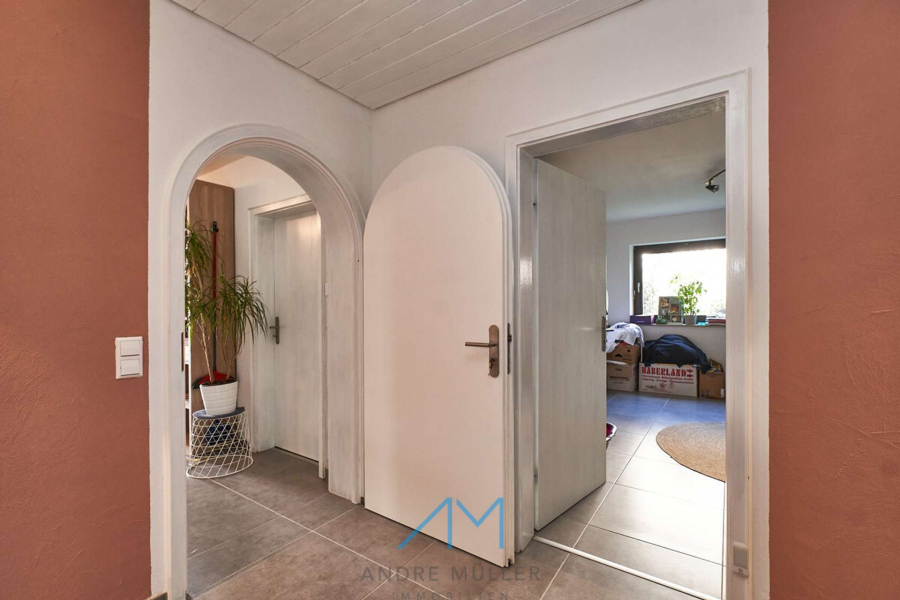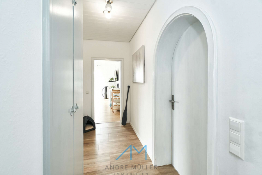 Wohnzimmer und zur Küche. Eine Garderobe schafft zusätzlichen Stauraum und sorgt dafür, dass alles ordentlich und aufgeräumt bleibt.