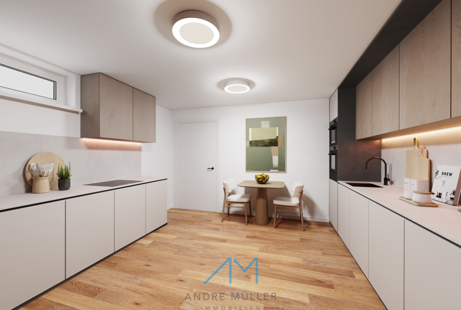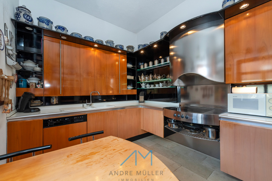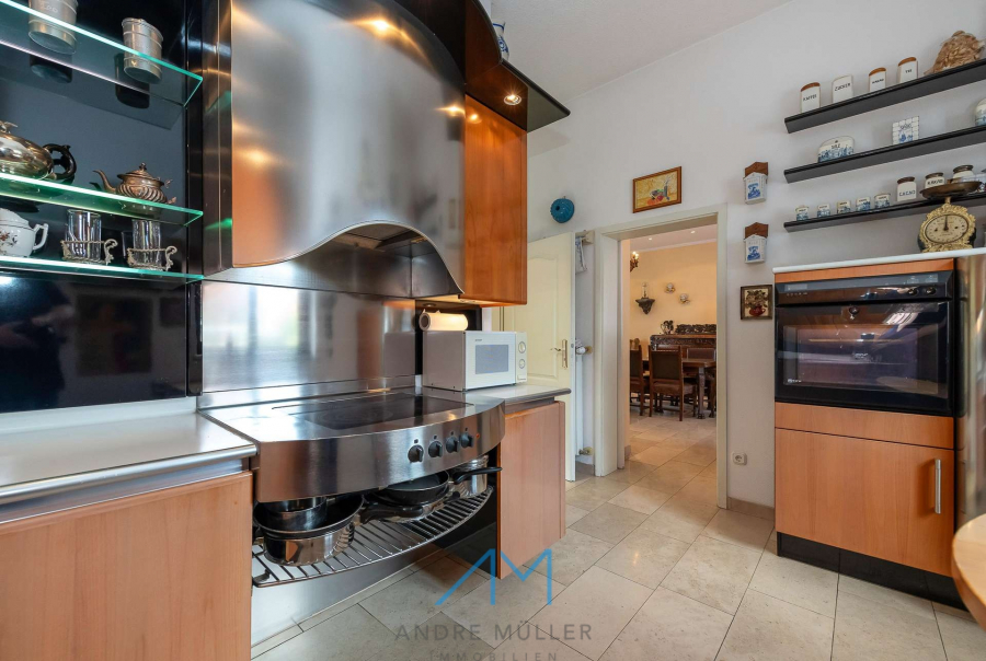 Bereits der helle Eingangsbereich vermittelt Großzügigkeit. Der weitläufige Wohn- und Essbereich begeistert mit edlen Travertinböden, einer lichten Deckenhöhe von ca. 3,10 m sowie einem markanten Erker, der dem Raum eine besondere Atmosphäre verleiht. Hier entstehen Wohnwelten, die sowohl repräsentativ als auch gemütlich sind. Die hochwertige Poggenpohl-Küche mit erstklassigen Geräten rundet das Erdgeschoss ideal ab – ein Ort, an dem Kochen, Design und Funktion Hand in Hand gehen.