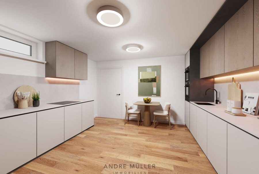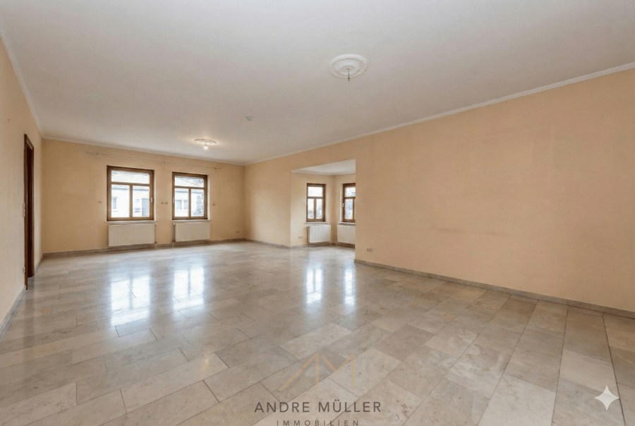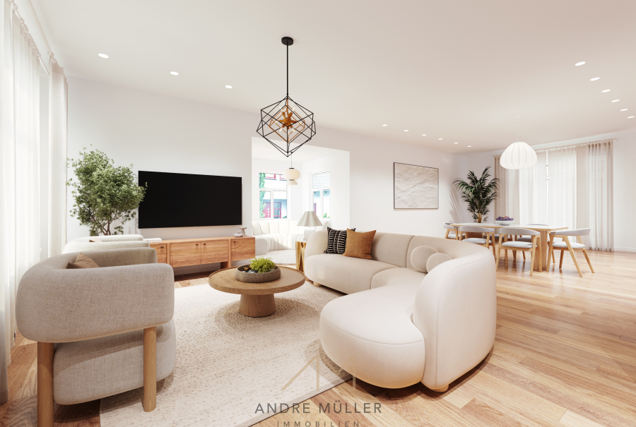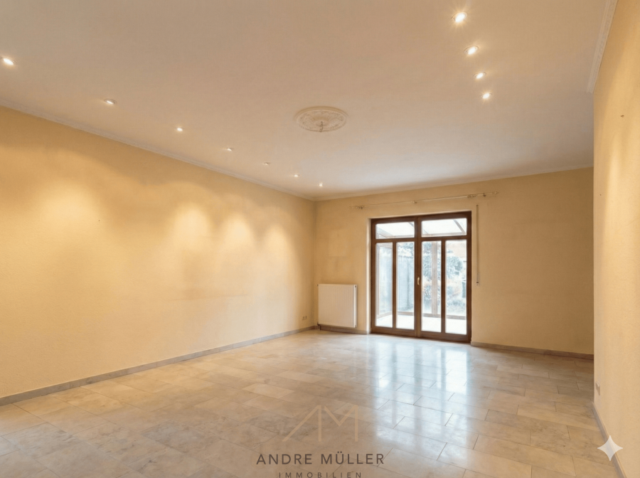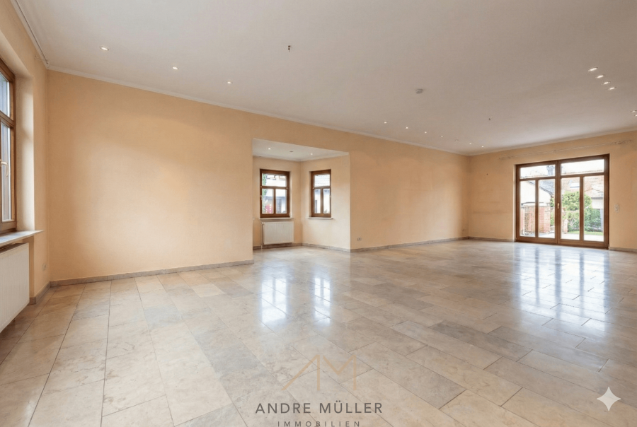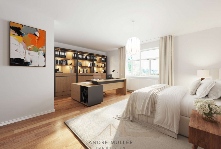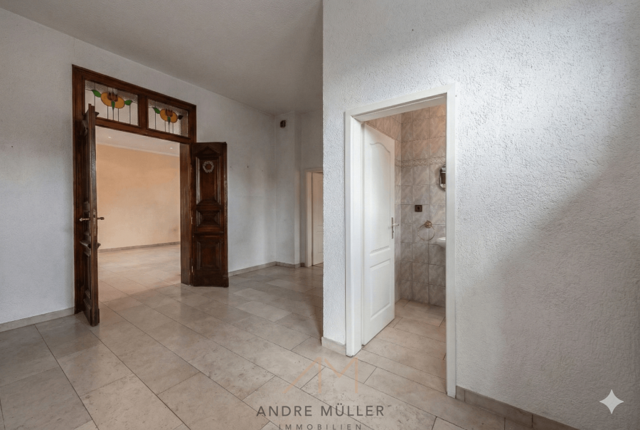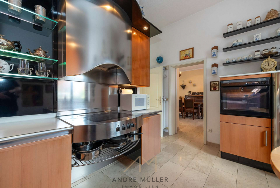Schon beim Eintreten spürt man die besondere Atmosphäre. Der helle Eingangsbereich schafft Weite und führt in den offen gestalteten Wohn und Essbereich. Travertinböden, eine Deckenhöhe von rund 3,10 m und der markante Erker sorgen für ein eindrucksvolles Raumgefühl. Hier lässt sich repräsentativ empfangen und zugleich entspannt leben. Die hochwertige Poggenpohl Küche mit Markengeräten fügt sich harmonisch ein und wird schnell zum Mittelpunkt des Alltags.
