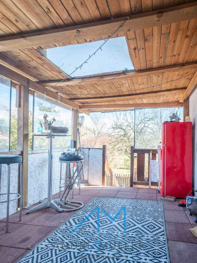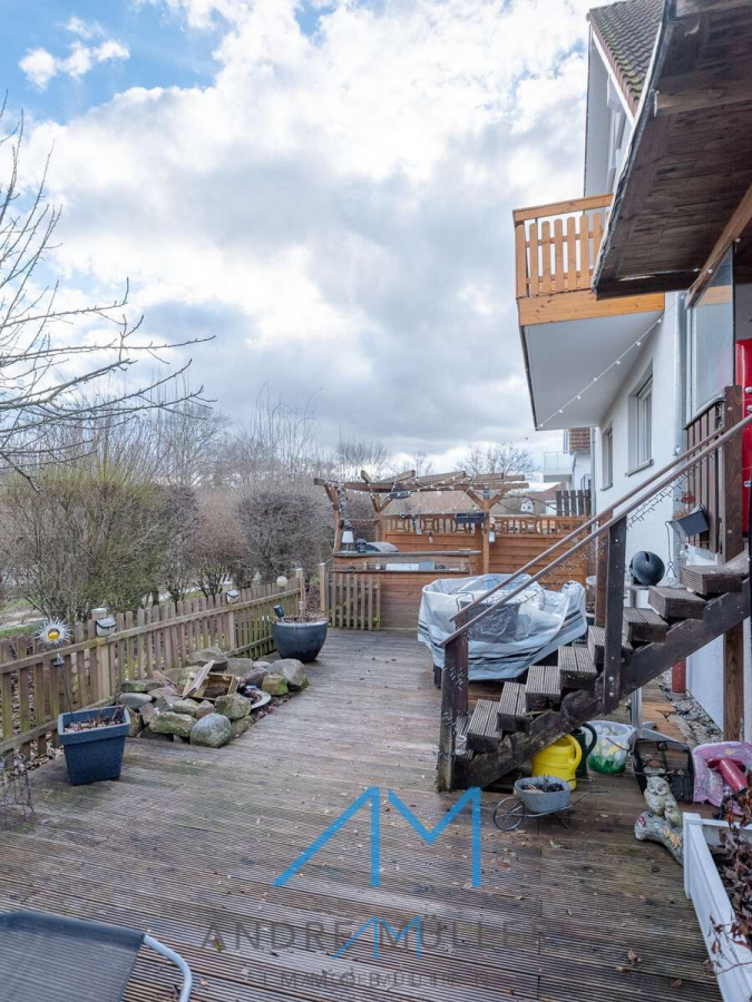 Die in Eigenleistung mit Holz verkleidete Terrasse verspricht idyllische Stunden im Freien und bietet die Möglichkeit, den unteren Bereich bei Bedarf in eine grüne Oase mit Wiese zu verwandeln.
